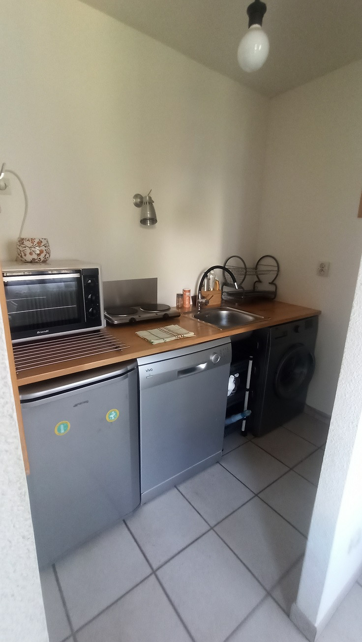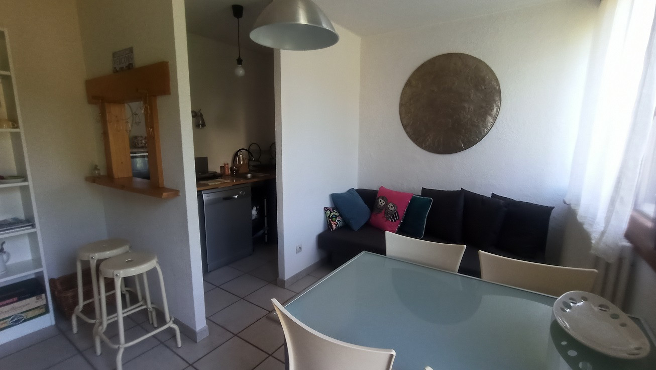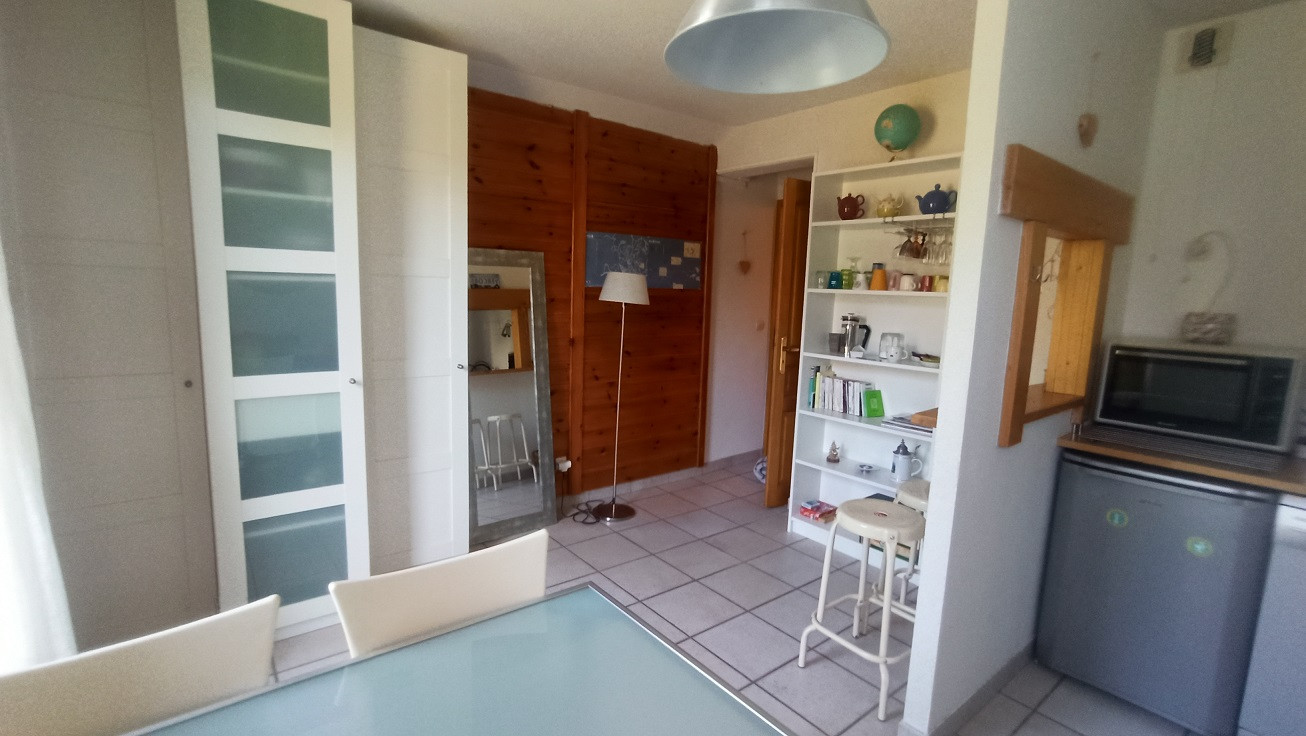 A 2' pas du centre, petite copropriété avec son parking privé pour les résidentes, coquet studio équipée pour 2 personnes : il comprend une entrée avec grands rangements, un wc ind, une salle de bains, une cuisine avec lave linge / lave vaisselle. un coin salon / coin repas donnant sur un balcon au calme, exposé plein Sud et vue sur le petite parc privé de la résidence.