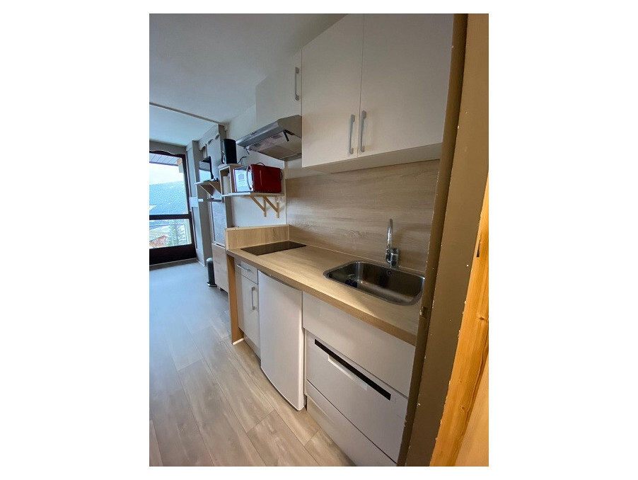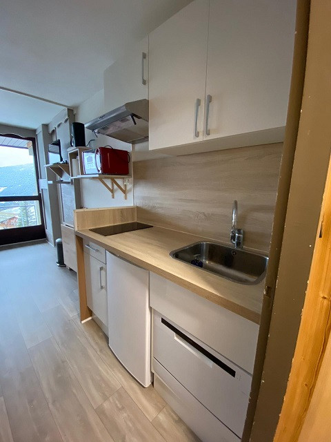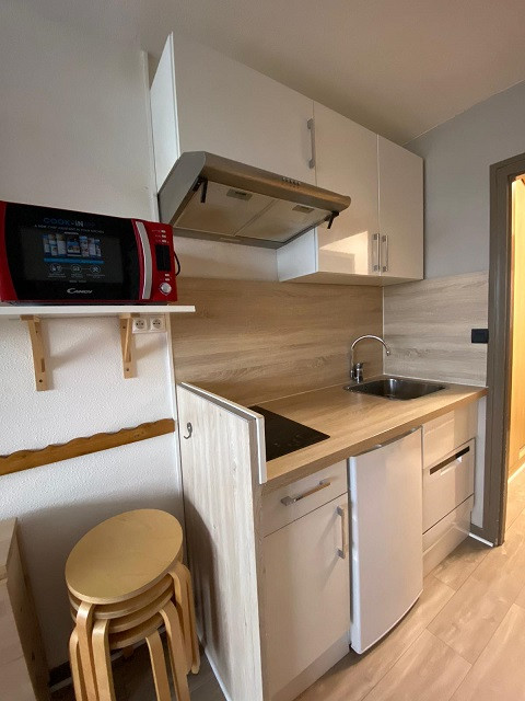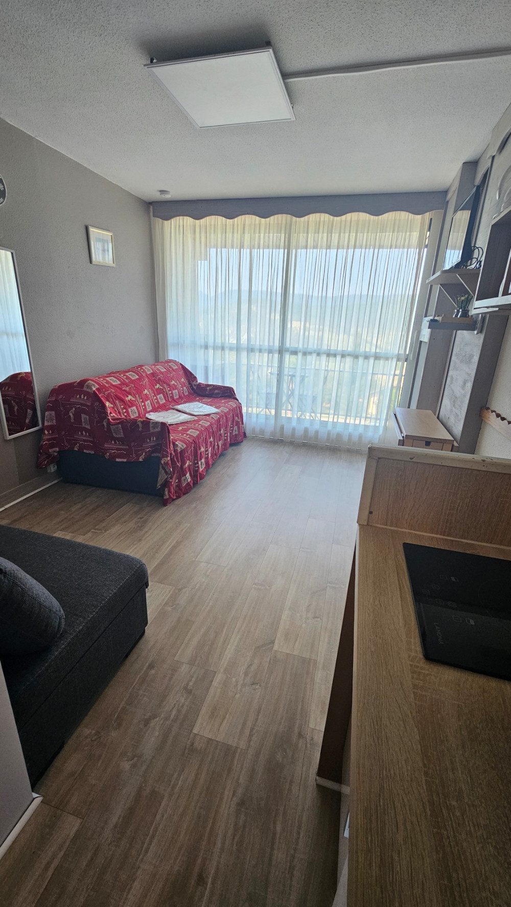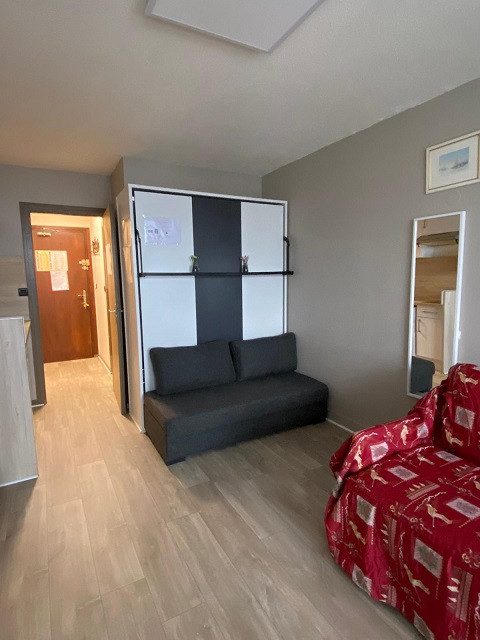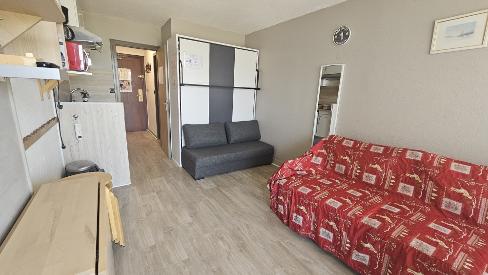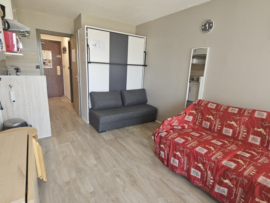 Studio refait avec goût, pratique et fonctionnel, il comprend une entrée avec de grands rangements, une salle d'eau (douche/wc), une kitchenette avec son coin repas, espace salon (lit rabattable 2pers/canapé convertible) donnant accès sur un balcon OUEST.