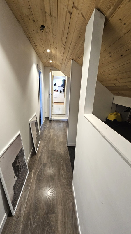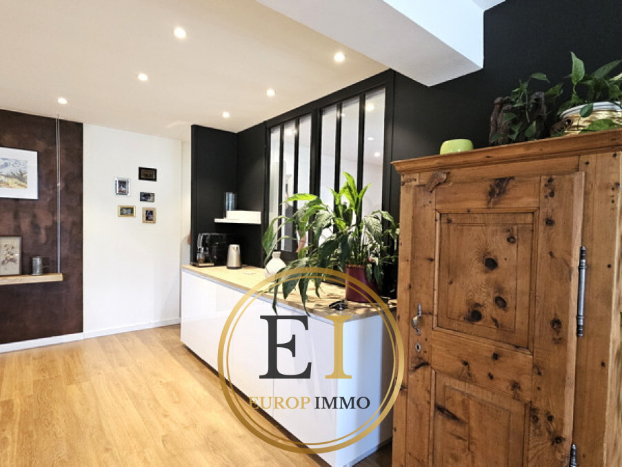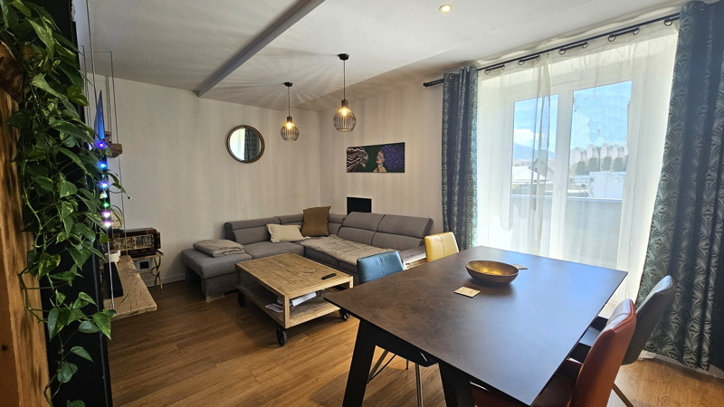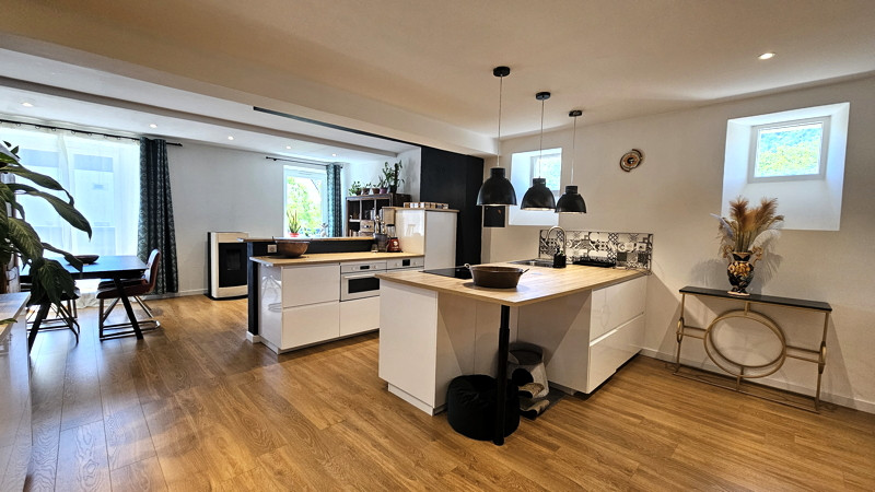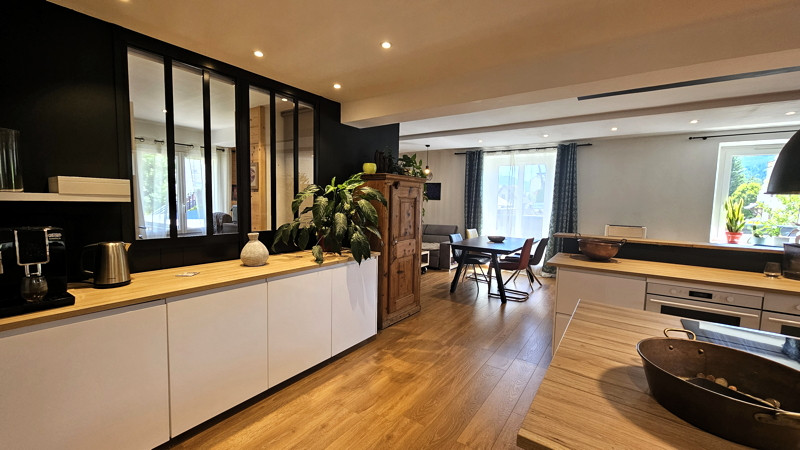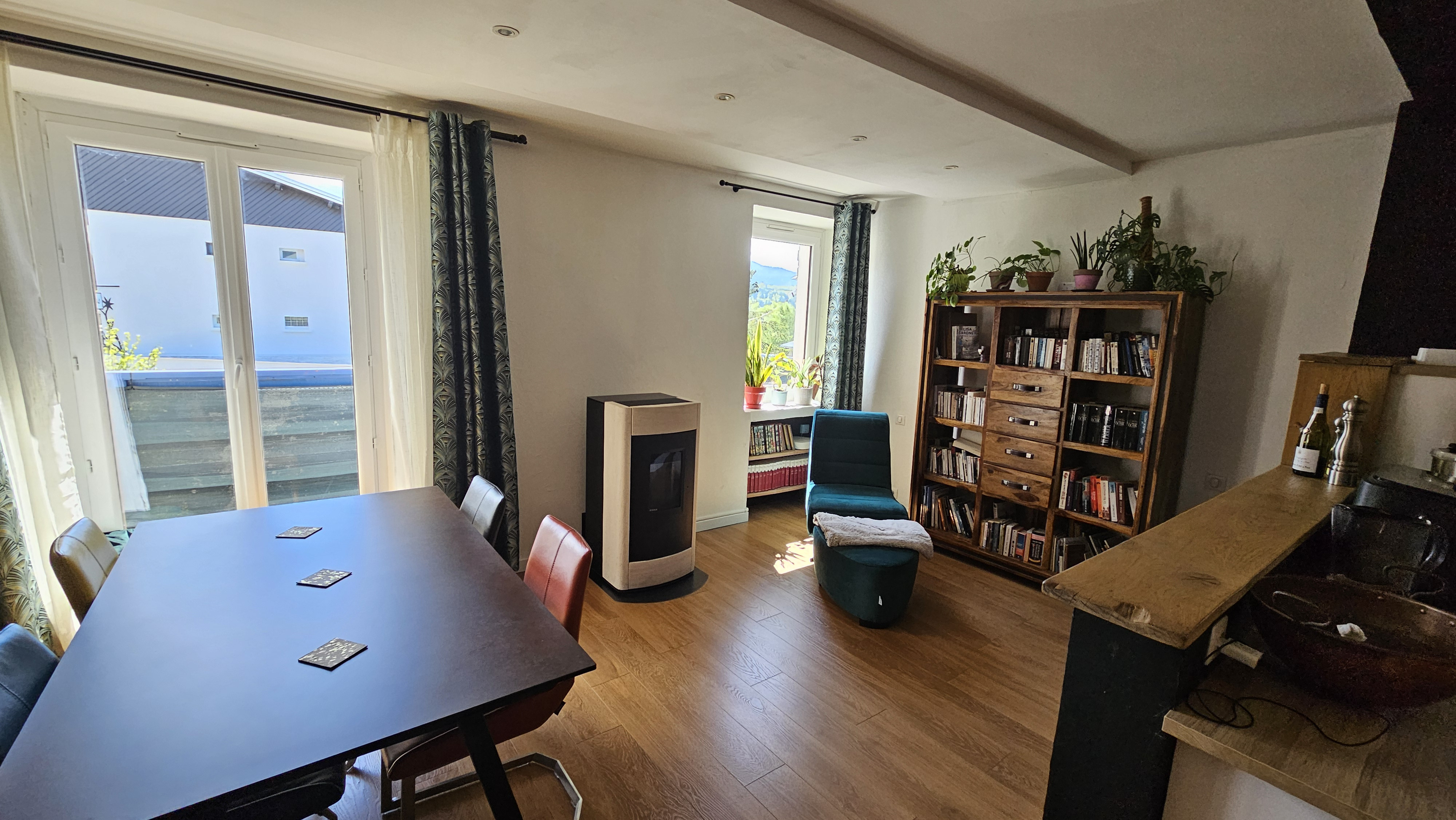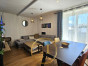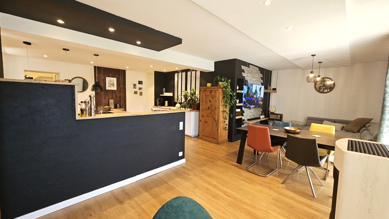BEL APPARTEMENT T4 de 125 M2 utilisables, seul sur son pallier avec : entrée, penderie, bel "ESPACE JOUR" de 47 M2 comprenant grande cuisine à l'américaine ( vraie ! ), séjour/salle à manger et SALON, COIN FEU avec POËLE ( de marque, à granulés ), BALCON SUD ( 9,5 M2 ) avec VUE EXTRA sur le village et les montagnes, chambre 1, salle d’eau avec bain et wc, dégagement, chambre 2, coin BUREAU, petite BUANDERIE et wc, chambre 3 avec sa propre salle d’eau avec douche et coin DRESSING.