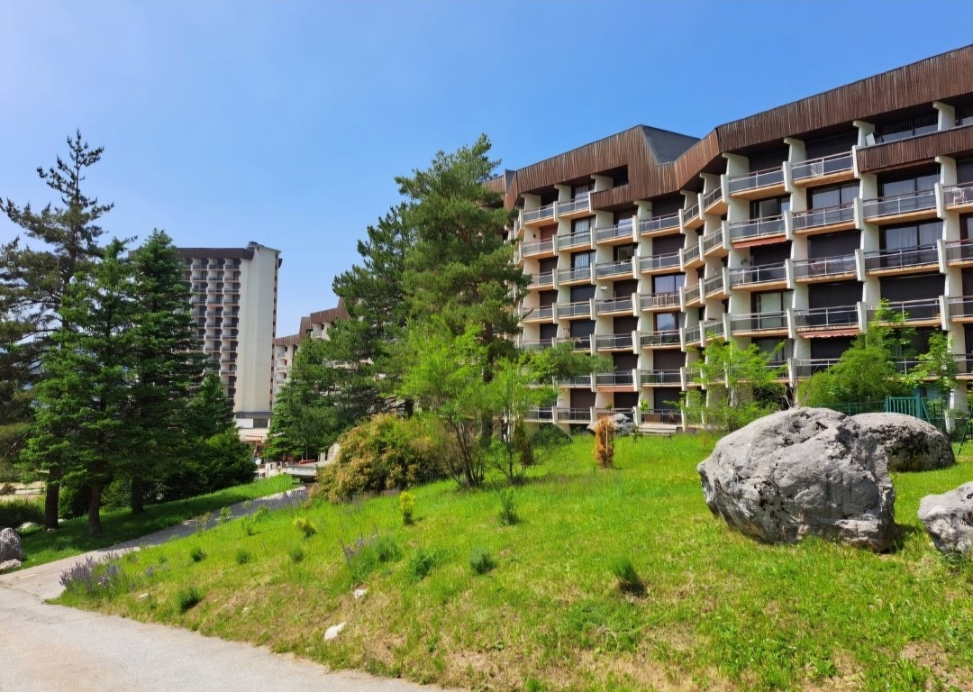 Dans l'ensemble immobilier Balcon de Villard, tout commerce sur place en saison, pelouses, jeux d'enfants, volley, boules, centre équestre à proximité etc... et le b...