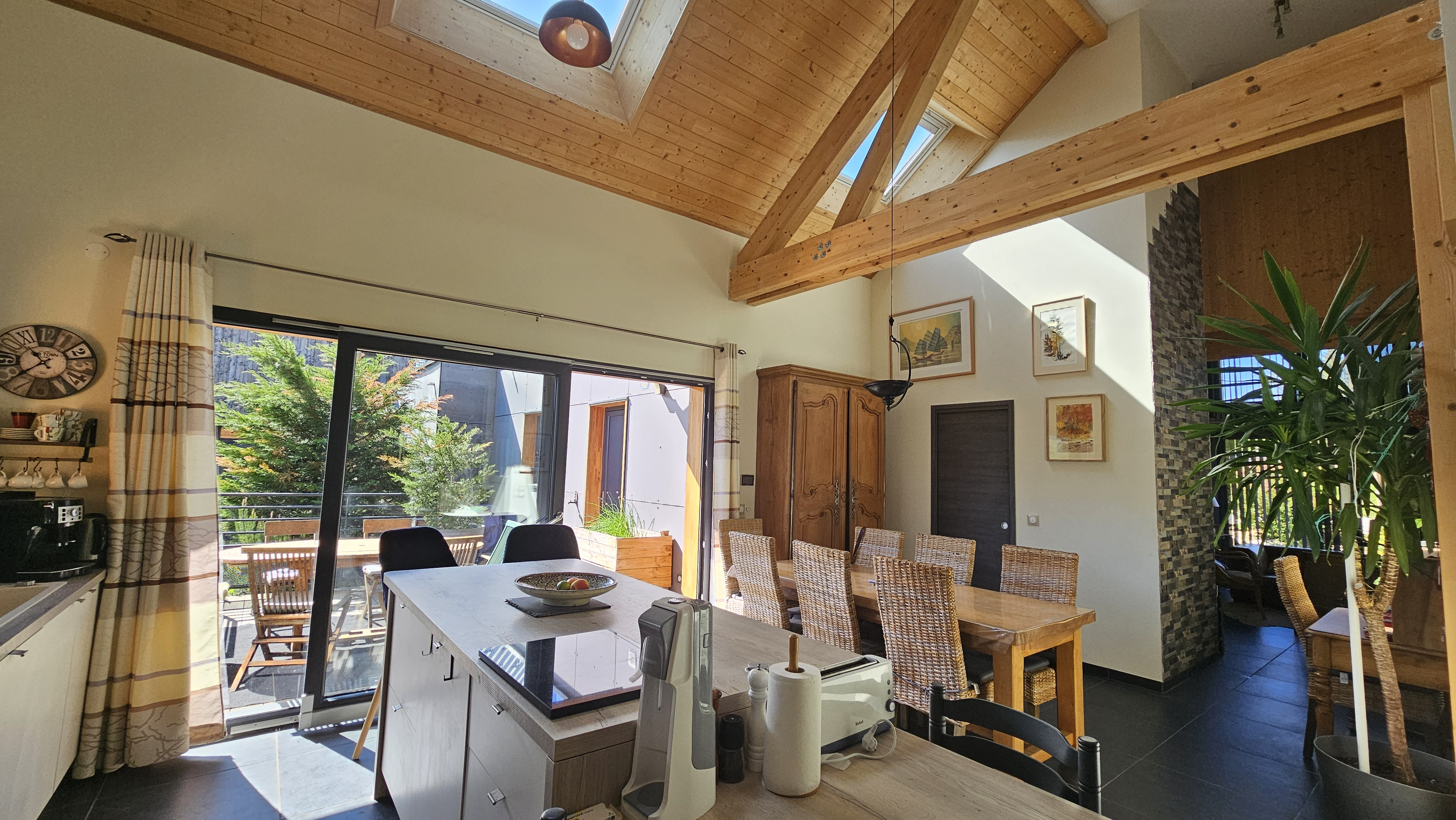 SALLE A MANGER avec BUANDERIE attenante ( accès direct au grand GARAGE double de 35 M2 ), SALON avec COIN FEU ( poêle à bois ),