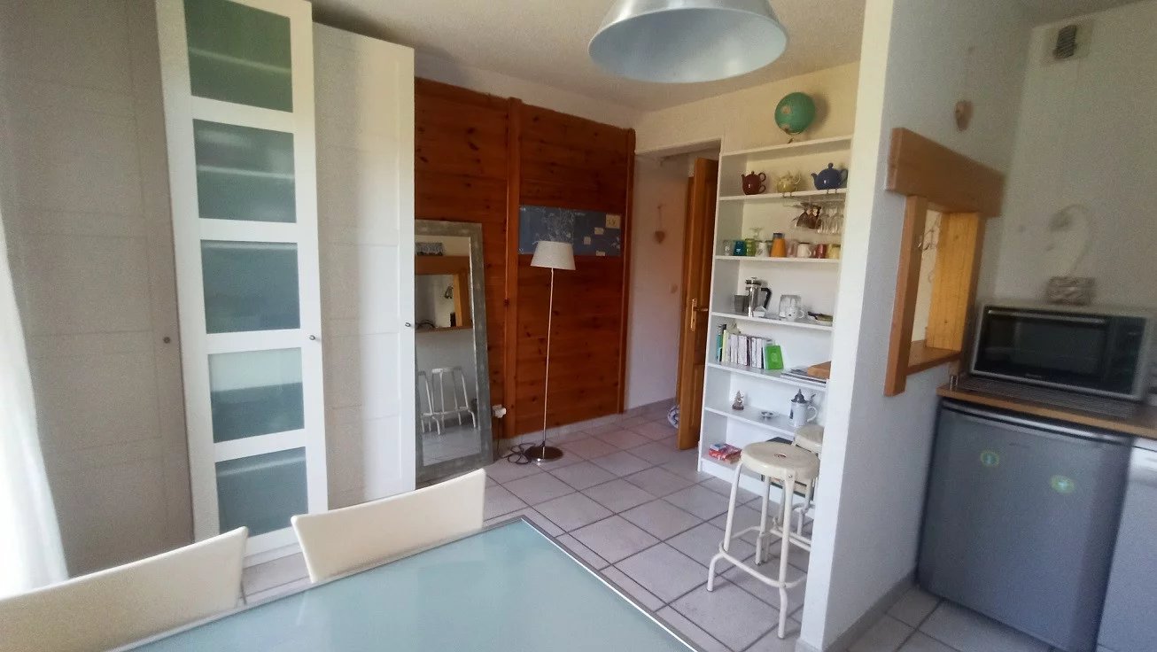 A 2' pas du centre, petite copropriété avec son parking privé pour les résidentes, coquet studio équipée pour 2 personnes : il comprend une entrée avec grands rangements, un wc ind, une salle de bains, une cuisine avec lave linge / lave vaisselle. un coin salon / coin repas donnant sur un balcon au calme, exposé plein Sud et vue sur le petite parc privé de la résidence.