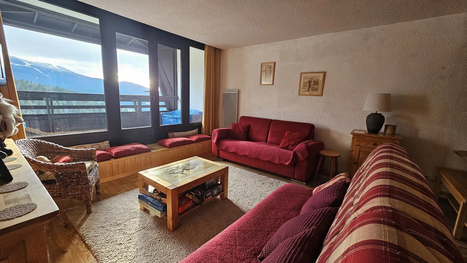 Après une journée sur les pistes, profitez de la vue sur les montagnes depuis le balcon ou détendez-vous dans l'espace de vie.